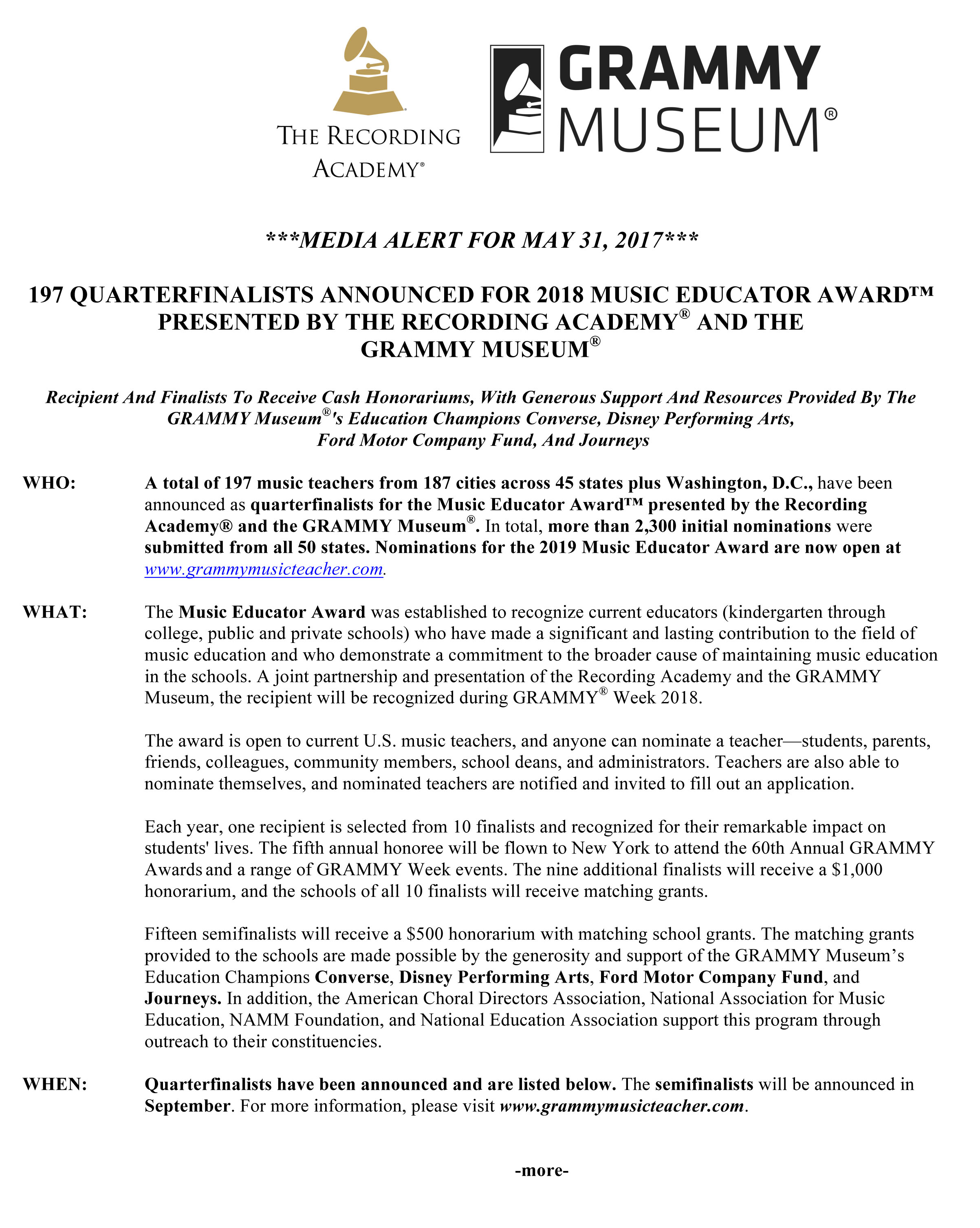 I'm a Quarterfinalist for the Recording Academy/Grammy Museum 2018 Music Educator Award. I'm honored and humbled.