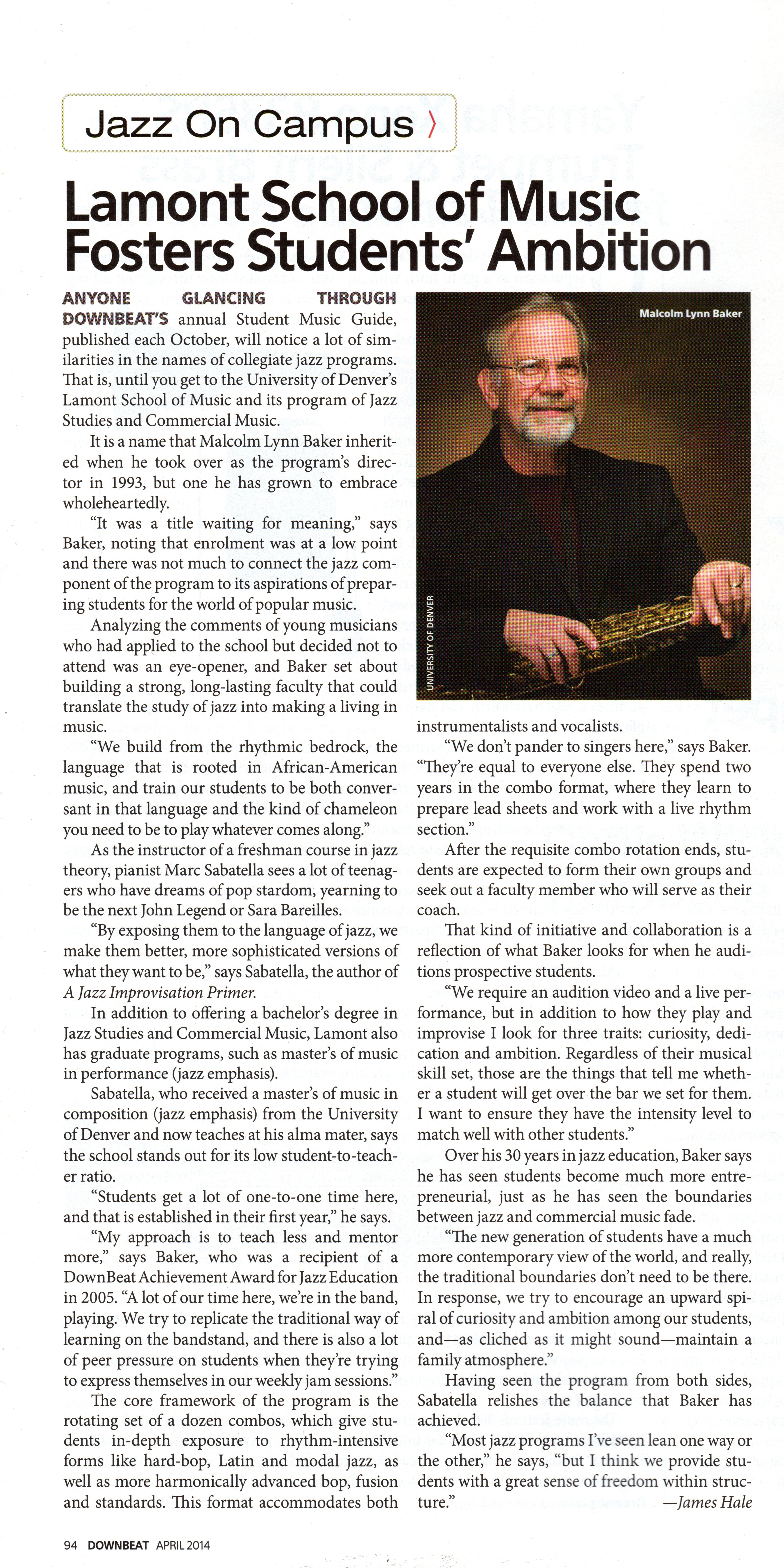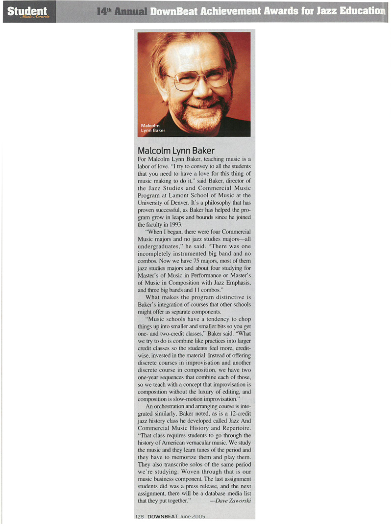 "I have known Lynn Baker for fifteen years and have to say that he is about as close to the whole package as anyone will find in the Jazz industry- performing, composing, arranging, educating, innovative, perspicacious administrating, curricular design that maximizes all the new technology can offer, and the uncanny ability to break down the false stylistic barriers in music education that others of less ecumenical capacity cloak as stylistic expertise by default. Lynn is brilliant, and effortlessly so. He takes himself far less seriously than those with a tenth of his talent or that the great fruits of his labors would warrant- for he is about crafting the future and not basking in the complacency of present accomplishments. For all who have had the fortune to work with him, he is a total joy to be with. Regardless of the setting, for Baker, music and its pure enjoyment come first. His infectious positive energy inspires his students to rise to their highest potential without the traditional teacher-student dialectic impeding either the development of vital expression or the transmission of core artistic values. For anyone interested in experiencing a most special musician, artist and educator, I suggest you click on his URL right now and open your date books wide."